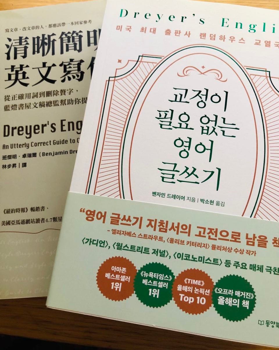 I learned the other day, via an extremely modest royalty payment,1 that the Korean edition of Dreyer’s English had earned out its advance, joining the Chinese edition, which had already done so some months ago.