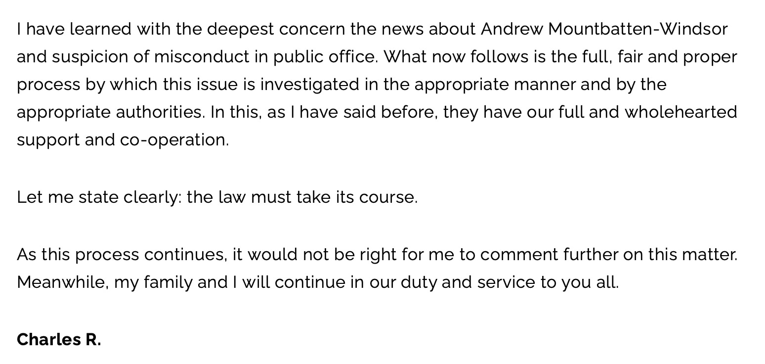 That Charles doesn’t refer to Andrew Mountbatten-Windsor as his brother is as sad as it’s unsurprising, and yet the concluding sentence is positively murderous, the “Meanwhile” conveying a loftily regal air of staring absently into the middle distance and whistling tunelessly,3 and “my family and I” making it perfectly clear that such a group does not include Andrew Mountbatten-Windsor—a real twist o’ the knife.4